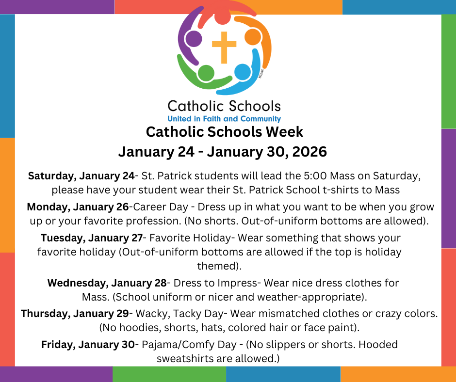 The St. Patrick Catholic School community provides a Christ centered education empowering students through leadership, service, and academic excellence. Our family atmosphere, rigorous curriculum, and individualized instruction equip students with the skills to become collaborative thinkers, moral problem solvers, and responsible citizens who make a positive impact on the world.